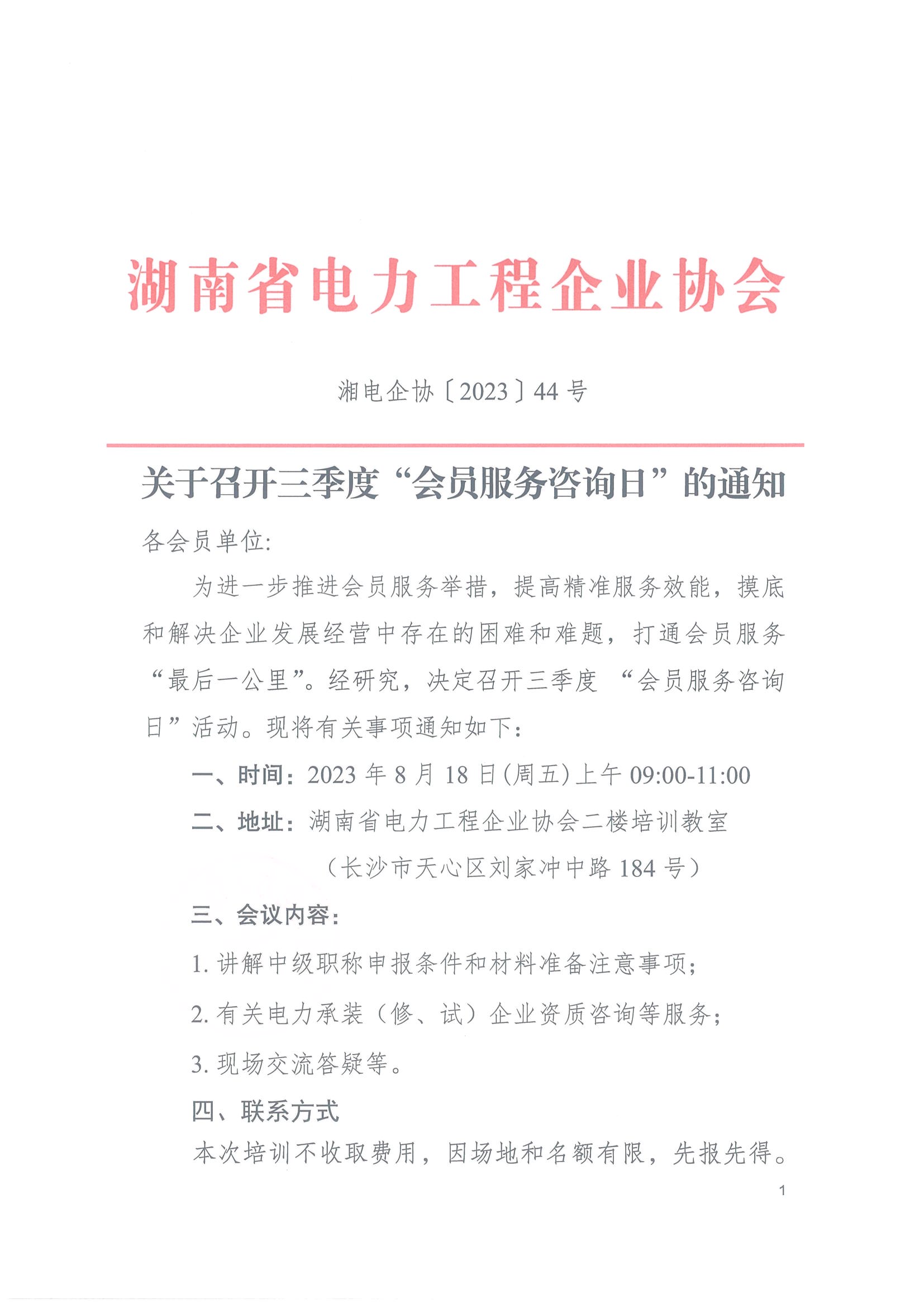 为进一步推进会员服务举措,提高精准服务效能,摸底和解决企业发展经营中存在的困难和难题,打通会员服务“最后一公里”。经研究,决定召开三季度 “会员服务咨询日”活动。现将有关事项通知如下: 一、时间:2023年8月18日(周五)上午09:00-11:00 二、地址:湖南省电力工程企业协会二楼培训教室(长沙市天心区刘家冲中路184号)