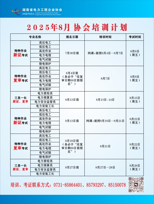 协会常年开设高压电工、低压电工、电力电缆、电气试验、继电保护、高处作业;主要负责人,安全生产管理人员、电力安全监督员、电力质检员、电力预算员、电力安装工长等培训。