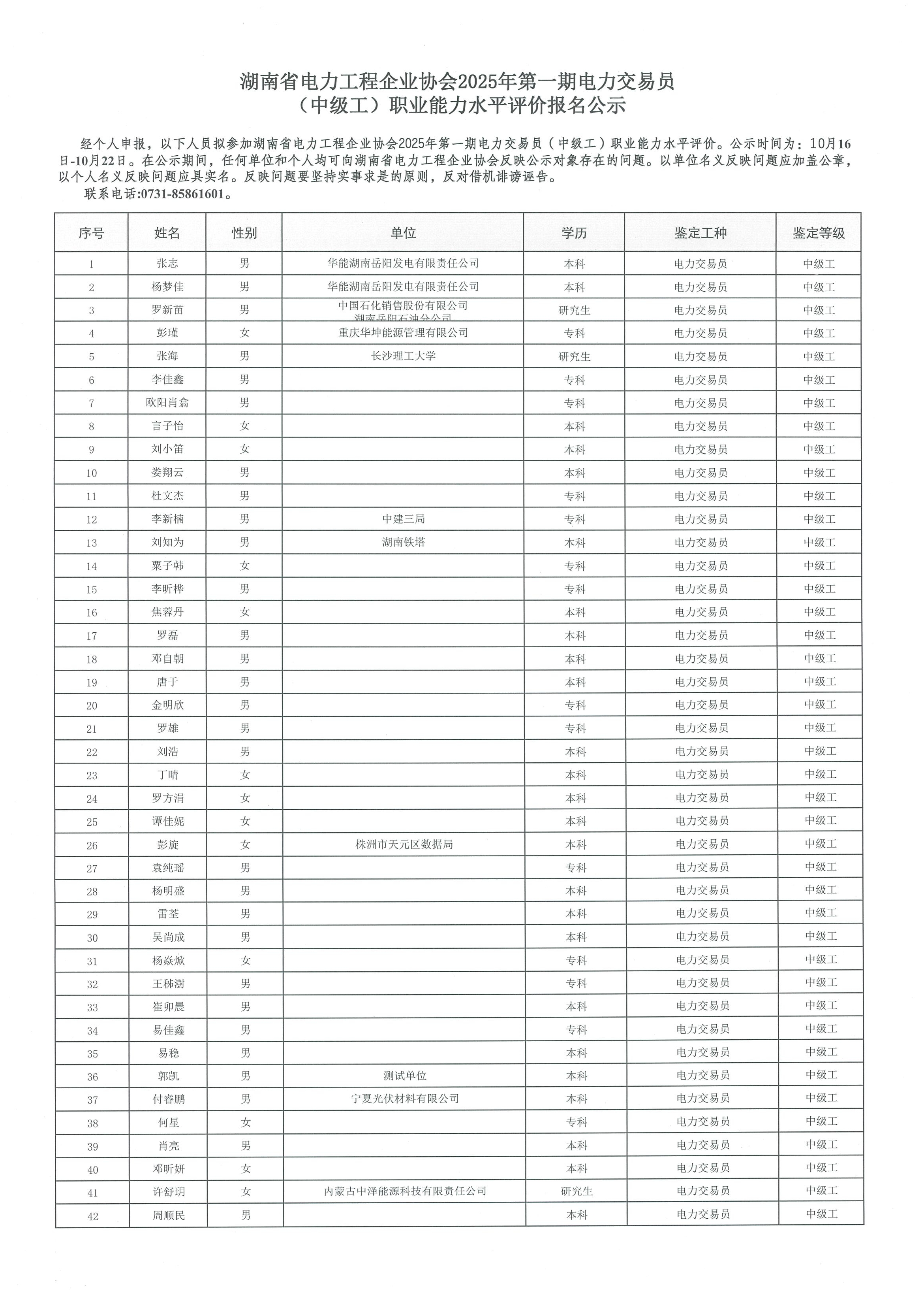 湖南省电力工程企业协会2025年第一期电力交易员 (中级工)职业能力水平评价报名公示