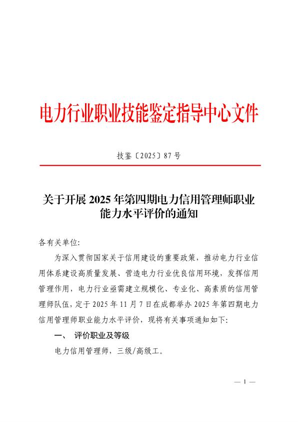 关于开展2025年第四期电力信用管理师职业能力水平评价的通知
