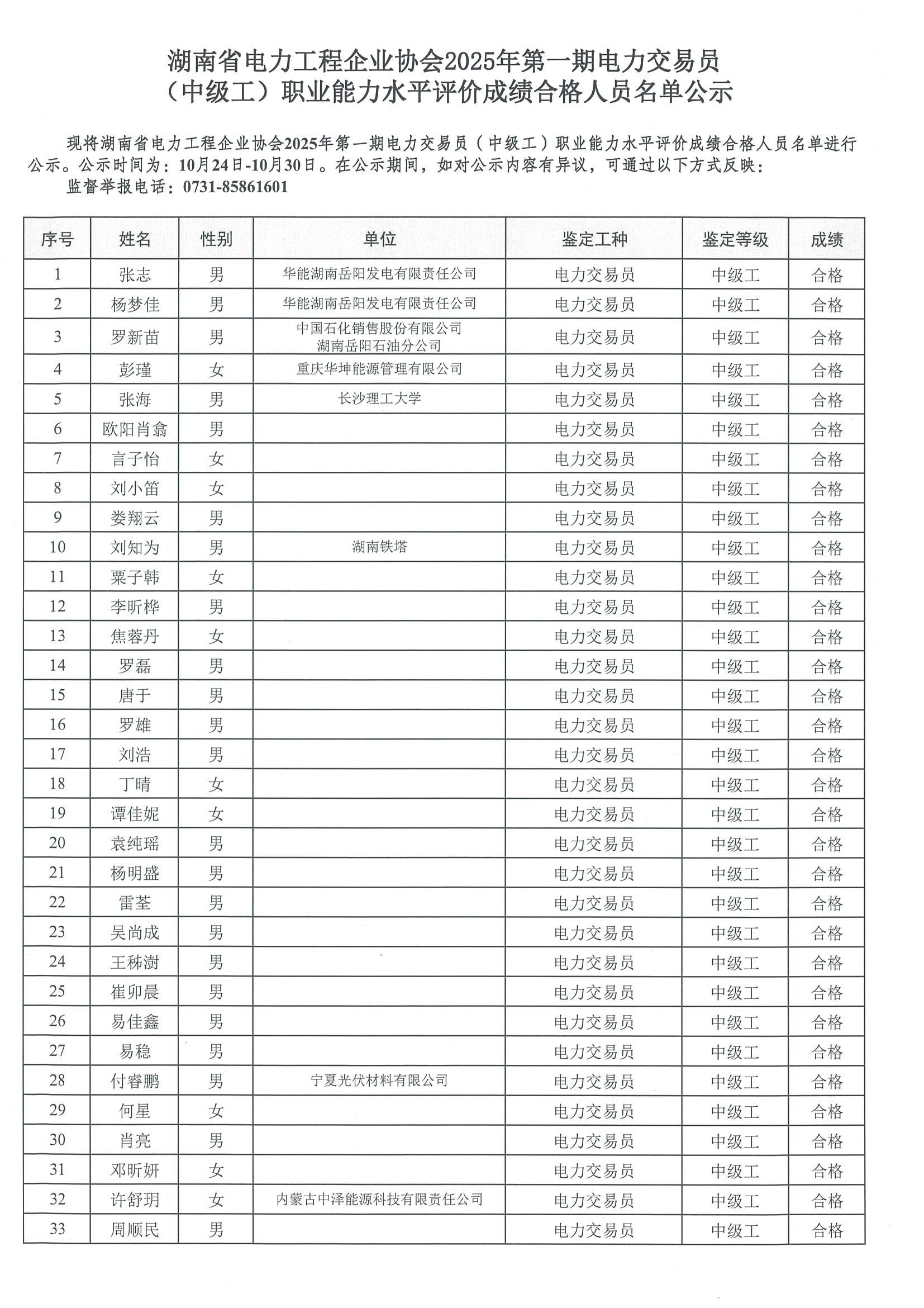 湖南省电力工程企业协会2025年第一期电力交易员 (中级工)职业能力水平评价成绩合格人员名单公示