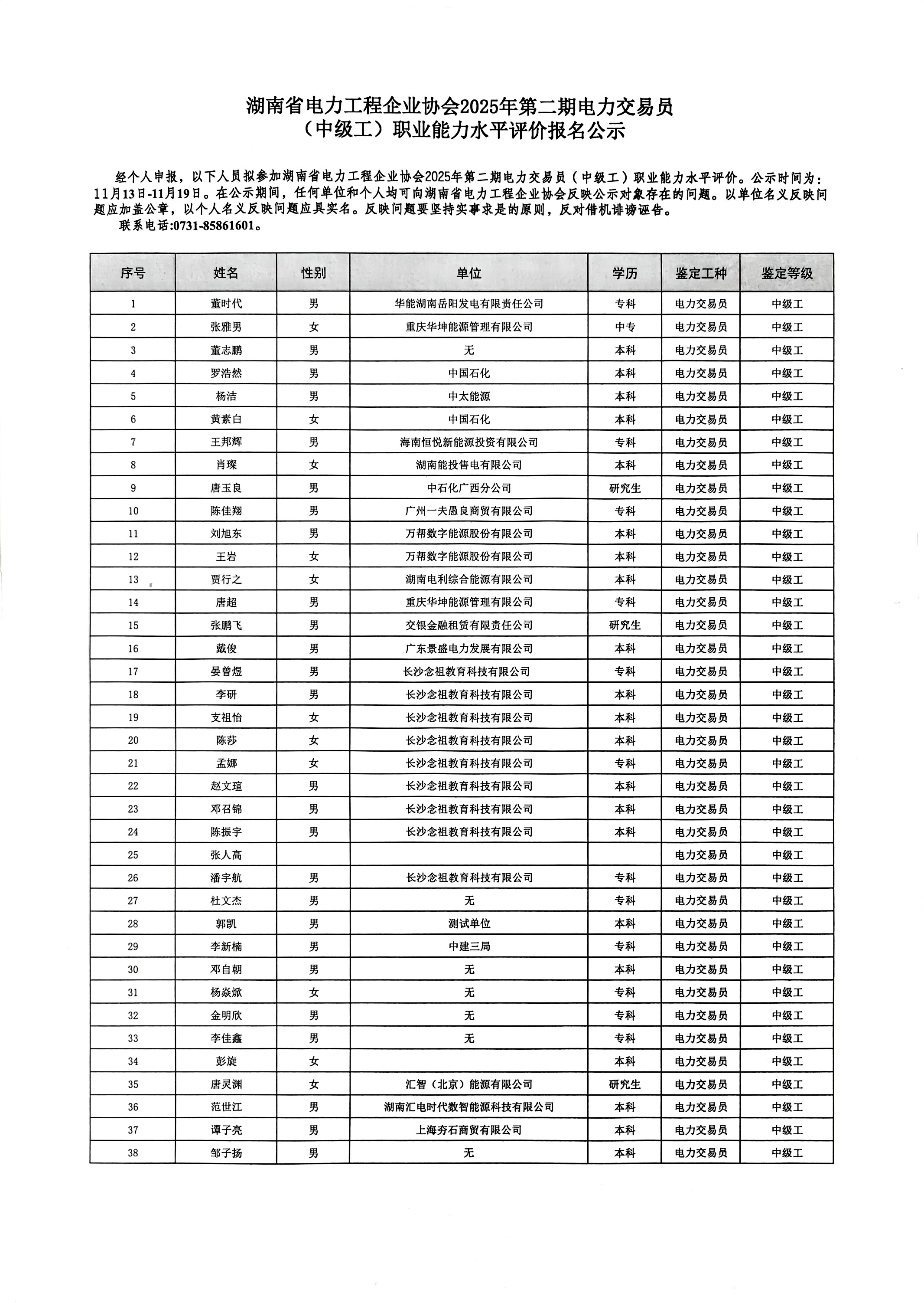 经个人申报,以下人员拟参加湖南省电力工程企业协会2025年第二期电力交易员(中级工)职业能力水平评价。公示时间为:11月13日-11月19日。在公示期间,任何单位和个人均可向湖南省电力工程企业协会反映公示对象存在的问题。以单位名义反映问题应加盖公章,以个人名义反映问题应具实名。反映问题要坚持实事求是的原则,反对借机诽谤诬告。
