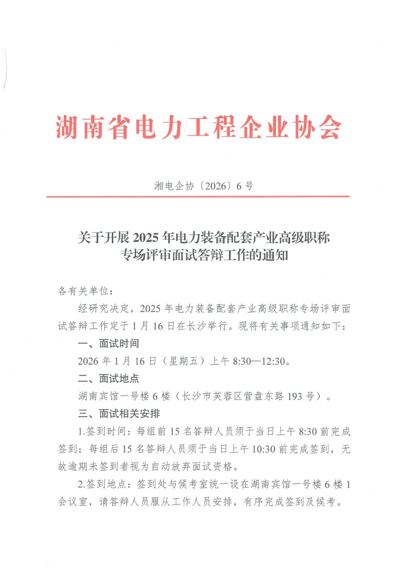 经研究决定,2025年电力装备配套产业高级职称专场评审面试答辩工作定于1月16日在长沙举行。现将有关事项通知如下: