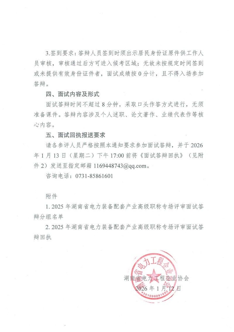请各参评人员严格按照本通知要求参加面试答辩,并于2026年1月13日(星期二)下午17:00前将《面试答辩回执》(见附件2)发送至指定邮1169448743@qq.com。